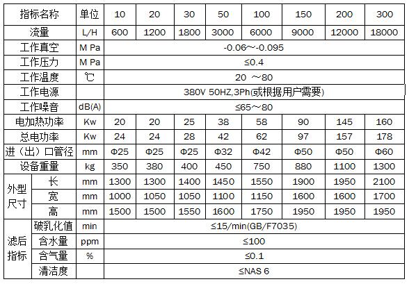 Z系列不銹鋼液壓油高效濾油機(jī)參數(shù):